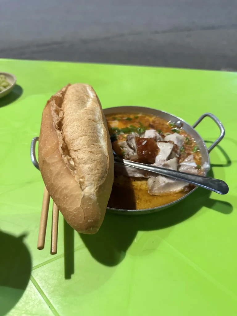 周りの現地の人たちを見ていると、スープの旨味が溶け出した汁に、ちぎったフランスパンを浸して美味しそうに食べていました。「あの食べ方がしたい」と思い、店員さんに「あのパンを追加で欲しい」と身振り手振りで伝えたところ、店員さんは元気よく「バインミー!」と言って、具材の何も挟まっていない、ただの素焼きのフランスパンを持ってきたのです。
