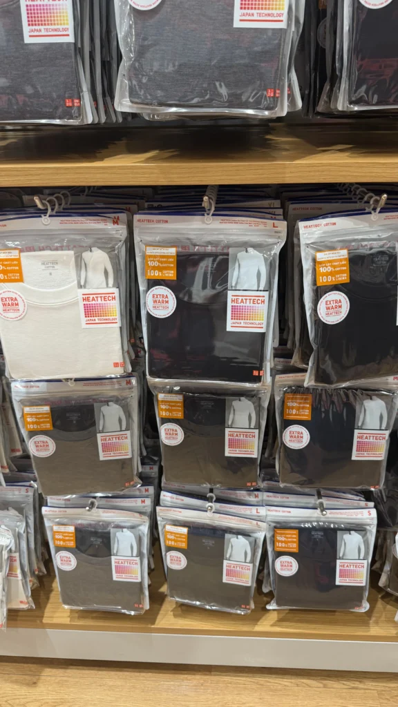 なんと、日本の真冬でおなじみの「極暖」や「超極暖」ヒートテックが、堂々と平積みされていたのです。